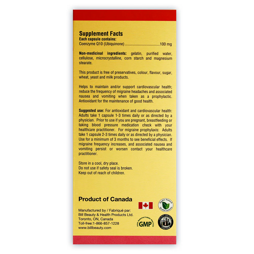 Bill CoQ10 is produced with no preservatives, colour, flavour, sugar, gluten, yeast, or dairy products. Each capsule is made with high quality ingredients. Our recommended dosage schedule will allow your body to absorb the most amount of CoQ10 efficiently. Bill maintains a high standard to ensure you get the most benefits out of each capsule. Enjoy the benefits of CoQ10 today!