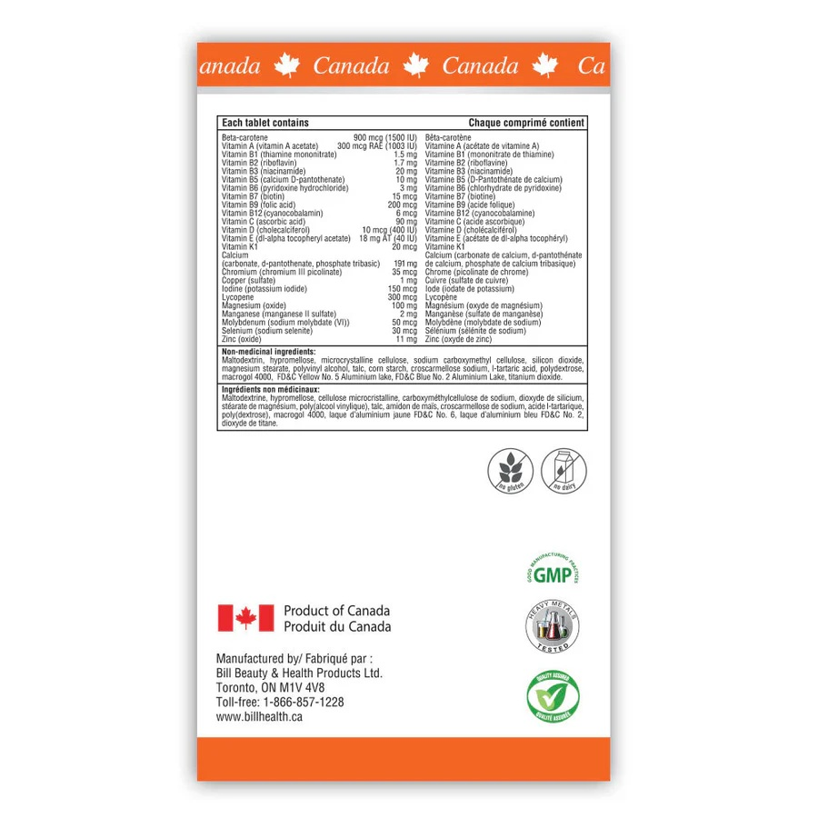 Our bodies need specific nutritional support as we age. BILL Natural Sources® Multi Complete Essentials for Men is specially formulated for men to obtain an optimum amount of essential vitamins and minerals to meet their daily needs. This formula is fortified with beta-carotene, zinc, calcium, natural antioxidants, and lycopene to add extra support for a healthy heart, bones and eyesight.Benefits of this product include: