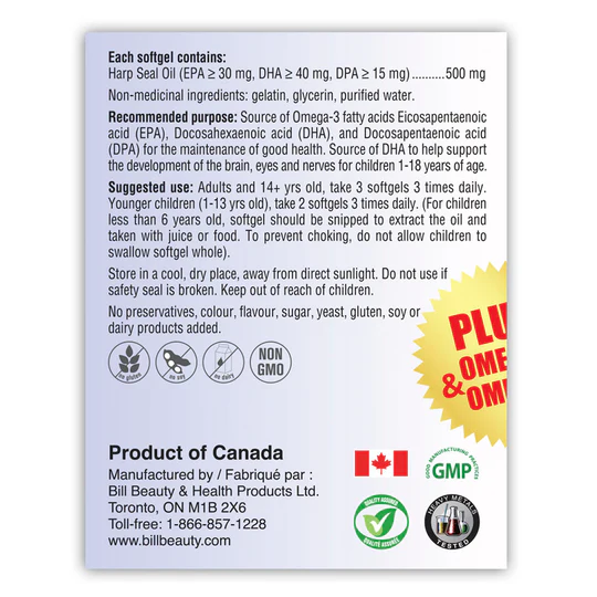 Omega-3 fatty acids are essential components that the human body cannot produce, and hence must be supplemented naturally. Seal oil is an excellent source of various Omega-3 essential fatty acids including Eicosapentaenoic Acid (EPA), Docosahexaenoic Acid (DHA), Docosapentaenoic Acid (DPA) and plays an important role in the development of the brain, eyes, and nervous system for children. EPA is a polyunsaturated fatty acid that is generally associated with lowering inflammation. DHA is a structural component of the brain, cerebral cortex, skin and retina. It is the most abundant omega-3 fatty acid in the brain and retina and plays a key role in the development of eye and nerve tissues. DPA is structurally similar to EPA and DHA and is associated with diverse nutritional and biological functions in the body. Seal oil is particularly rich in DPA compared to other marine oils.